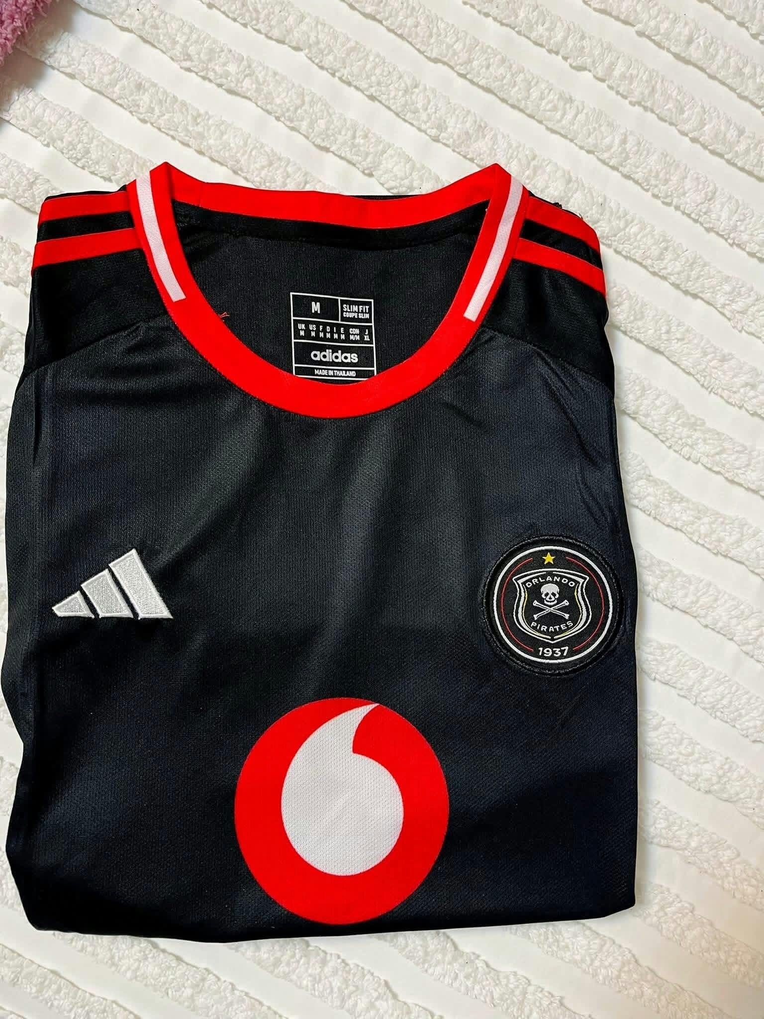 The Orlando Pirates 25/26 Home Kit stays true — bold black, crisp white stripes, and fiery red detailing.